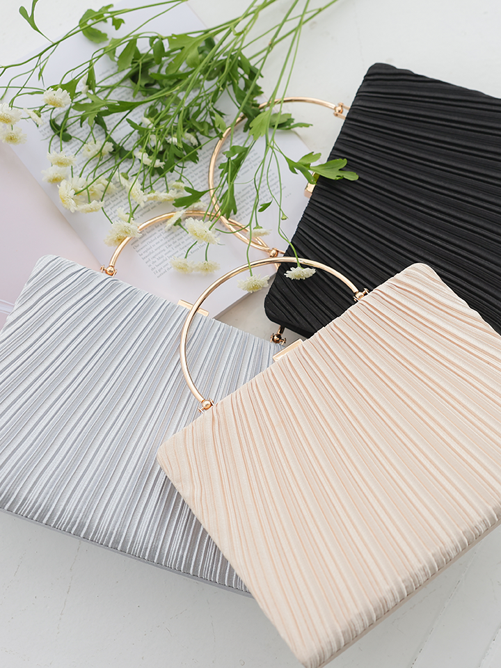 上品なプリーツデザインが目を引く、クラシカルな雰囲気漂うパーティーバッグ。