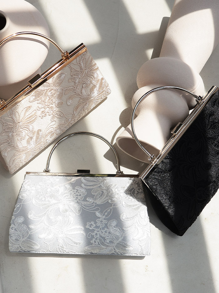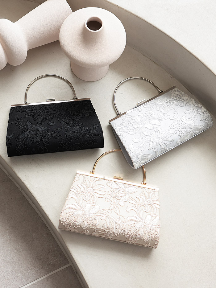 立体感のある刺繍レースがバッグ前面に施されたエレガントなバッグです。