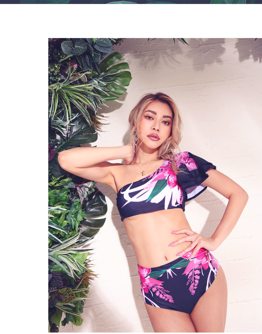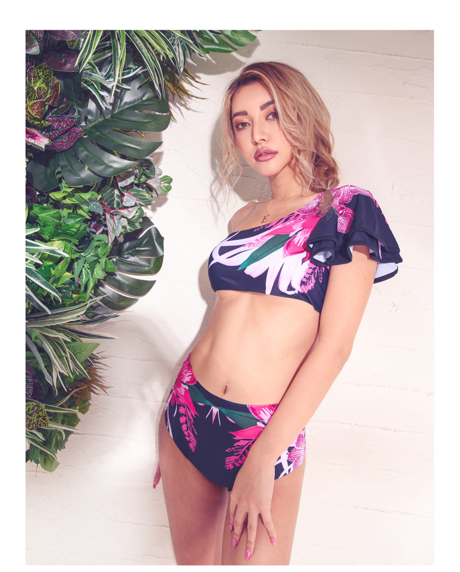 花柄とフリルデザインがキュートなのに黒が入る事で大人の女性によく似合う水着セット。