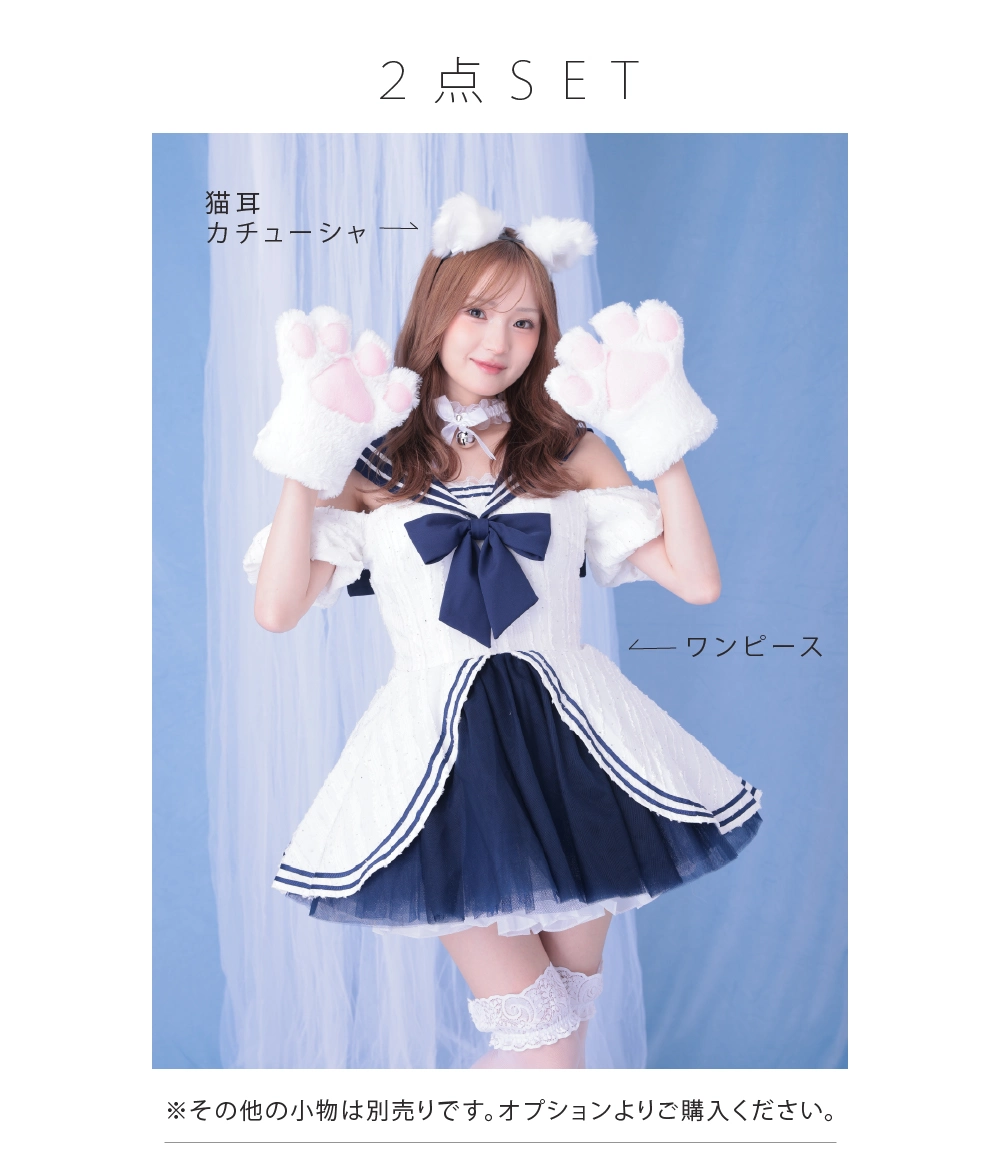 清楚でフェミニンな印象を与える、ホワイト×ネイビーのマリンセーラーワンピースコスチューム♡