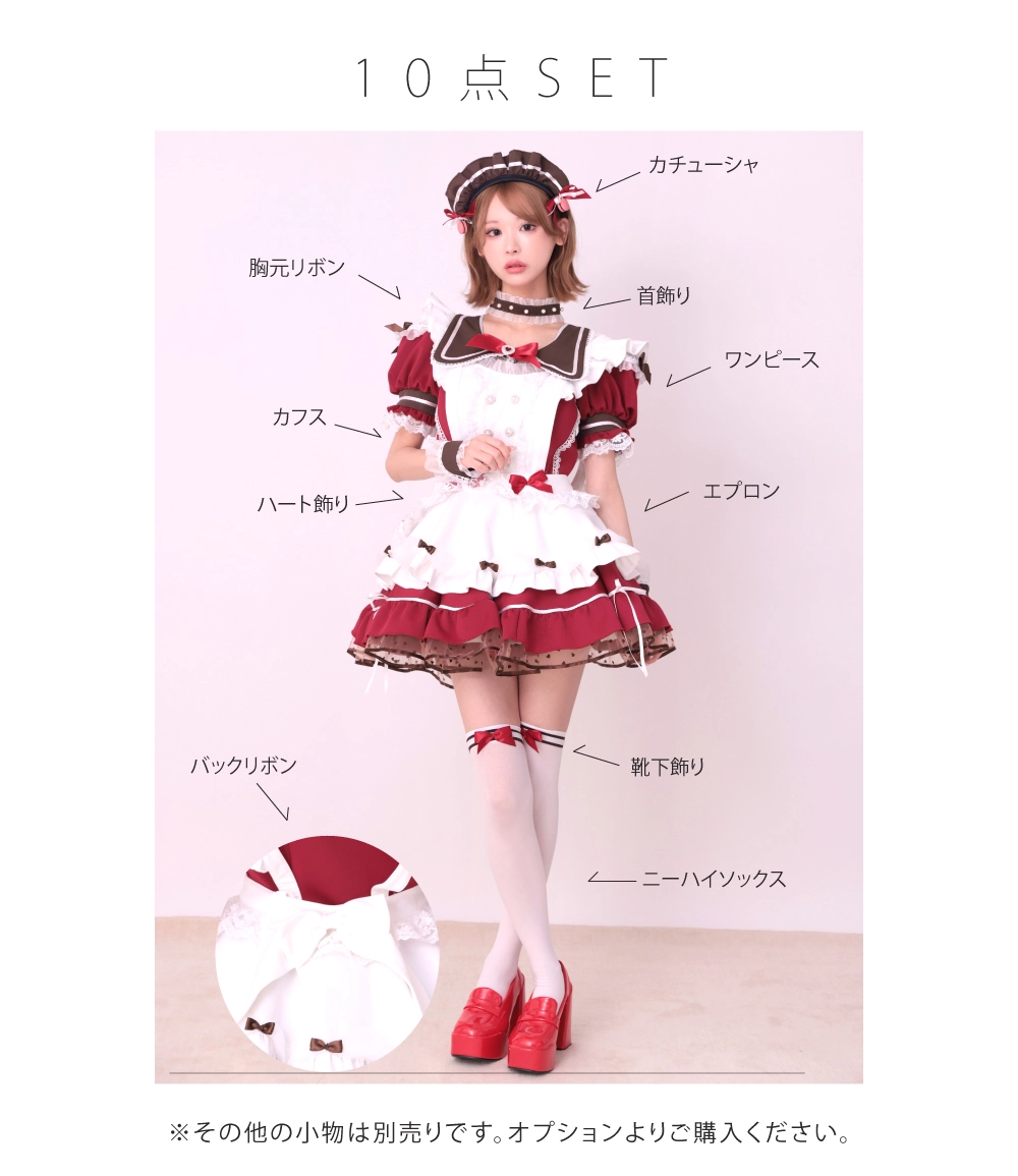 ワンピース・エプロン・カチューシャ・首飾り・胸元リボン・バックリボン・カフス・ハート飾り・靴下飾り・ニーハイソックス