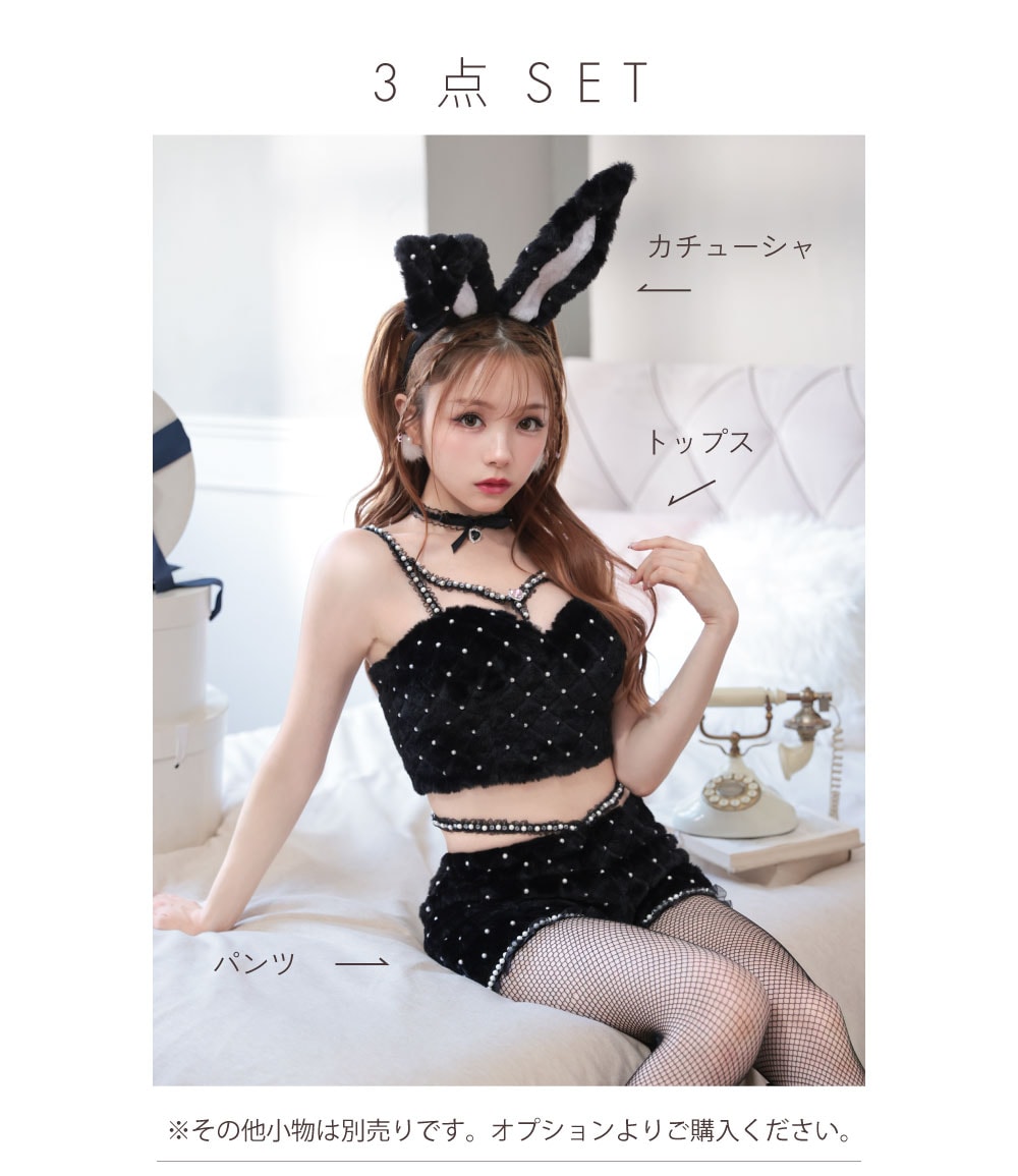 4. 【3点セット】C'est mimi fourrure bunny パールビジュー×黒ファー バニーガール コスプレ パンツタイプ ブラック vcsbn-240315-1b