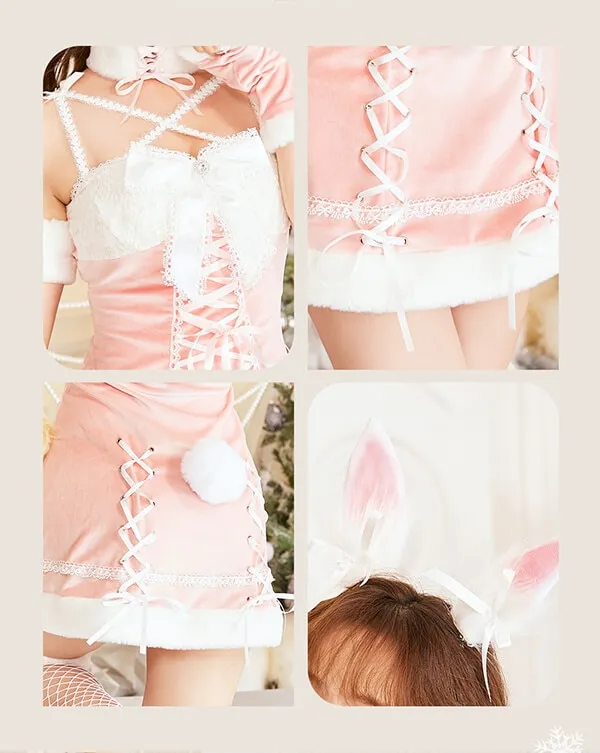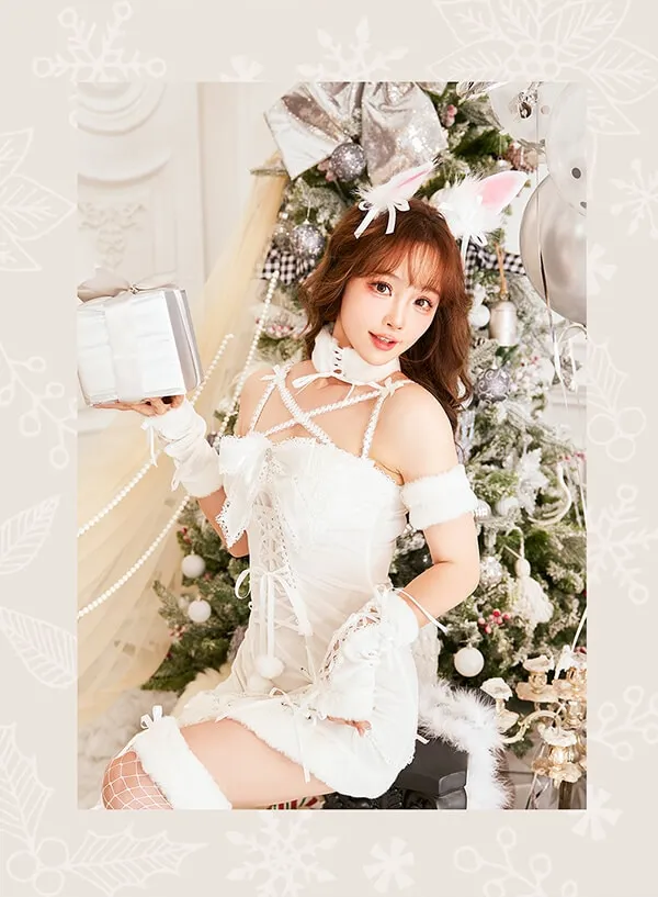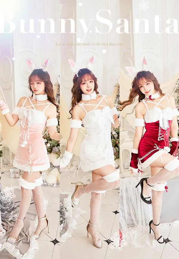 胸元のレースクロスデザインがワンポイントのバニーサンタコスチューム8点セット☆☆彡