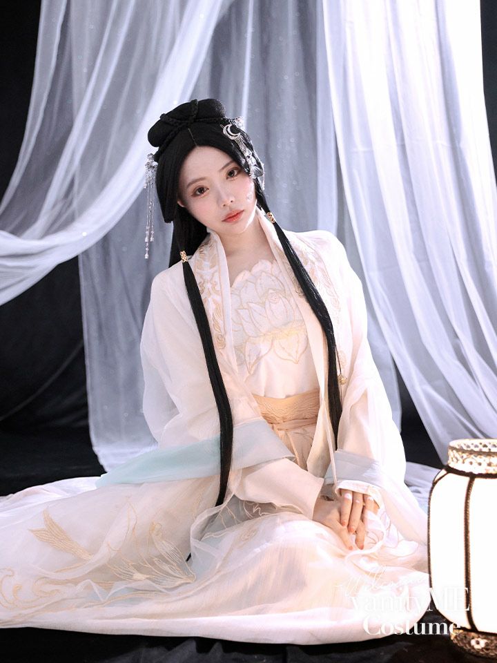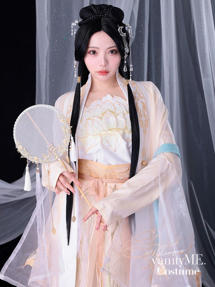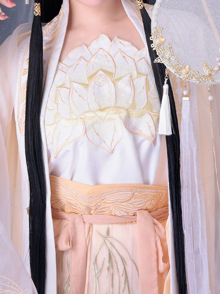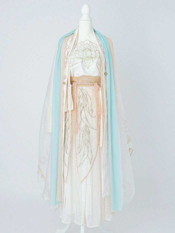トップスには金糸で描かれた蓮の花刺繍があしらわれ、清らかで高貴な雰囲気を演出。
