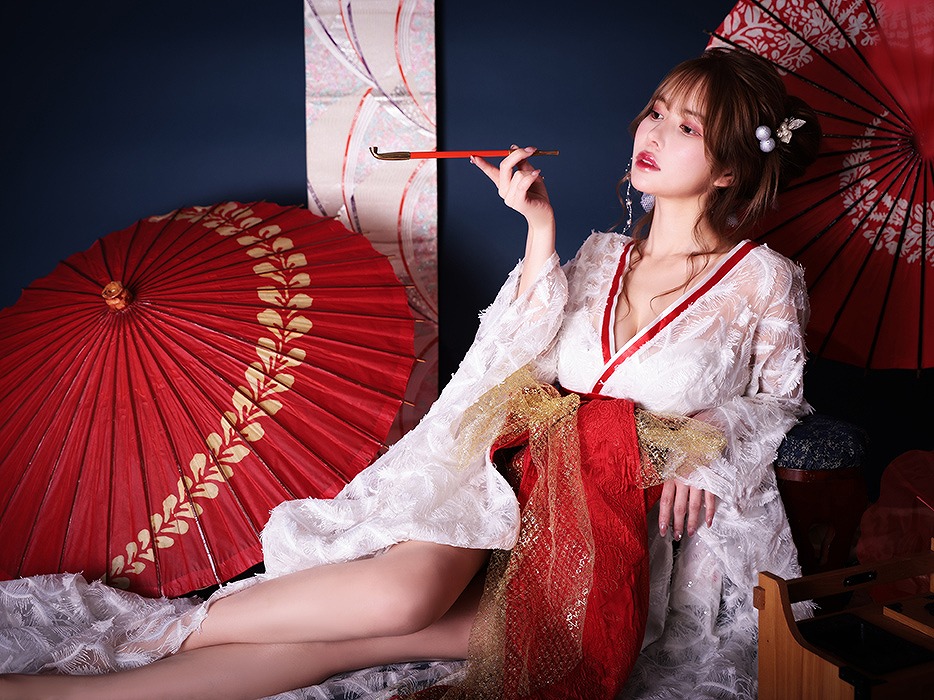 3. 花魁コスチューム フェザー花魁 白×赤 vcsot-190305-1-ma