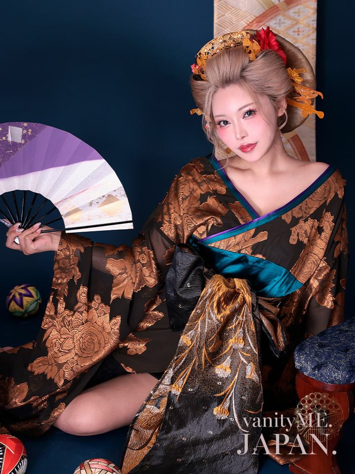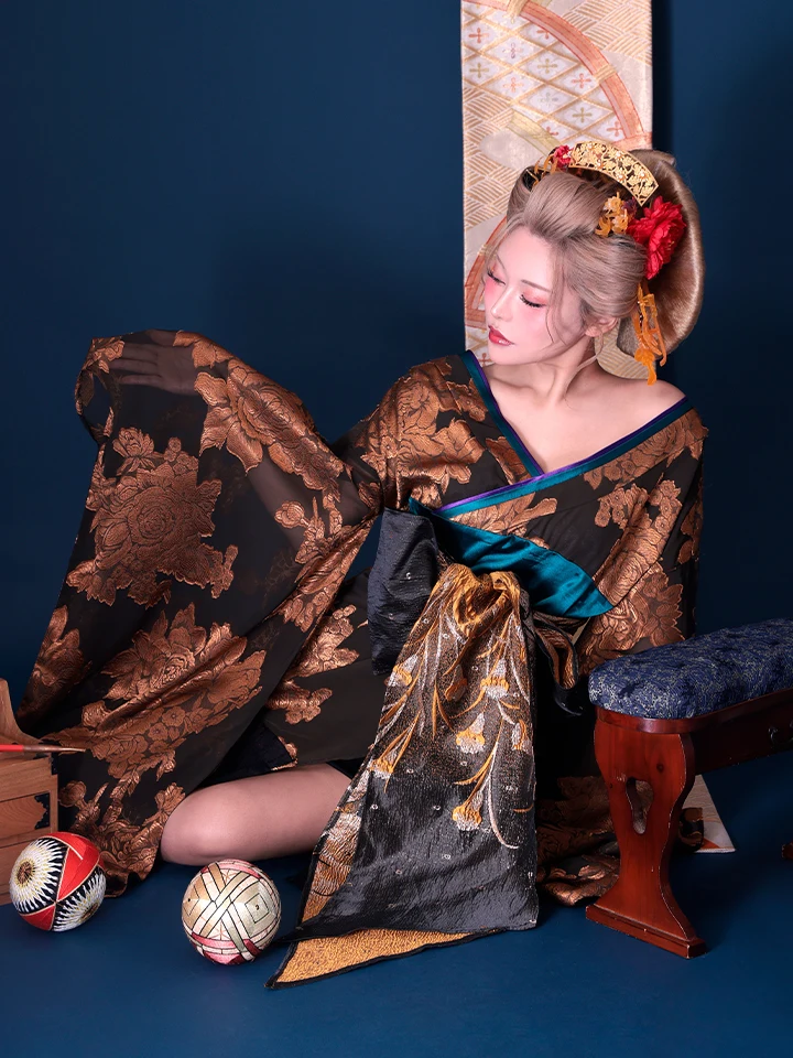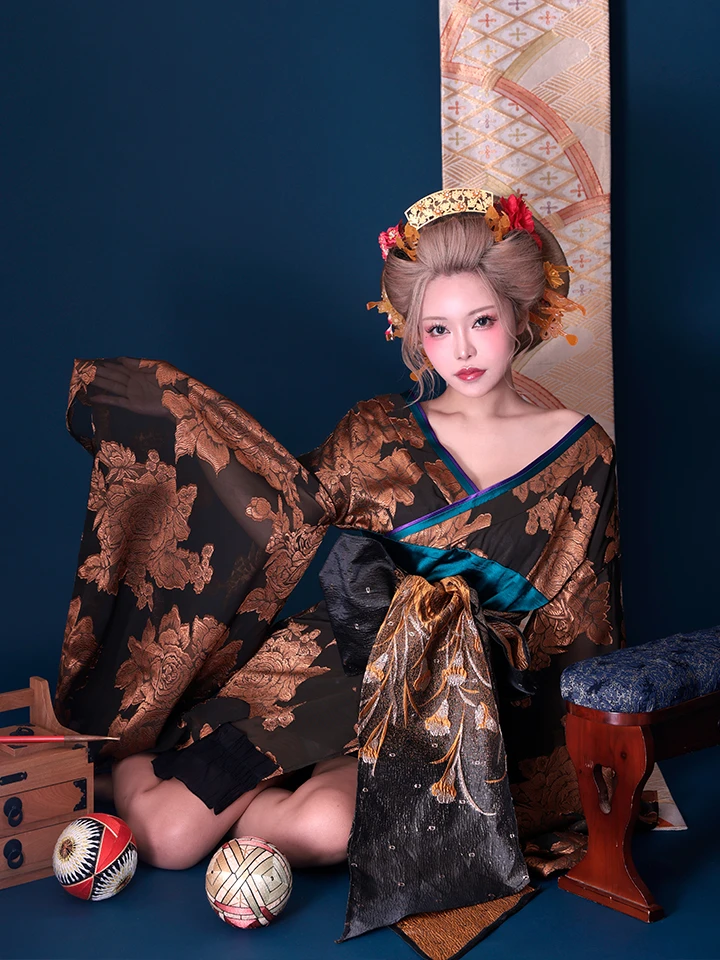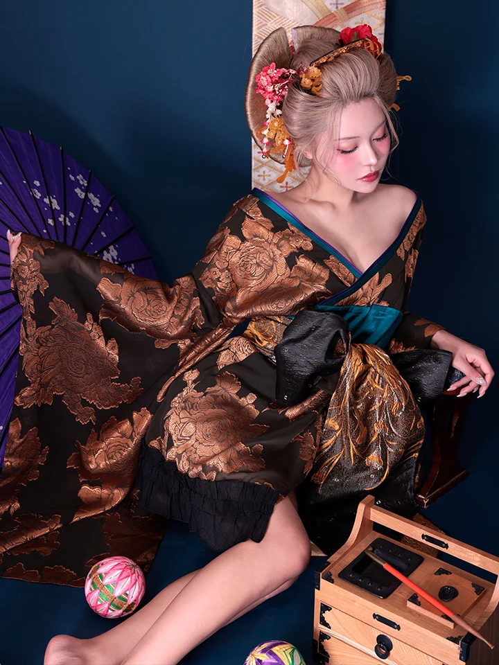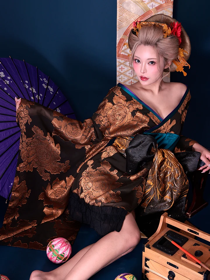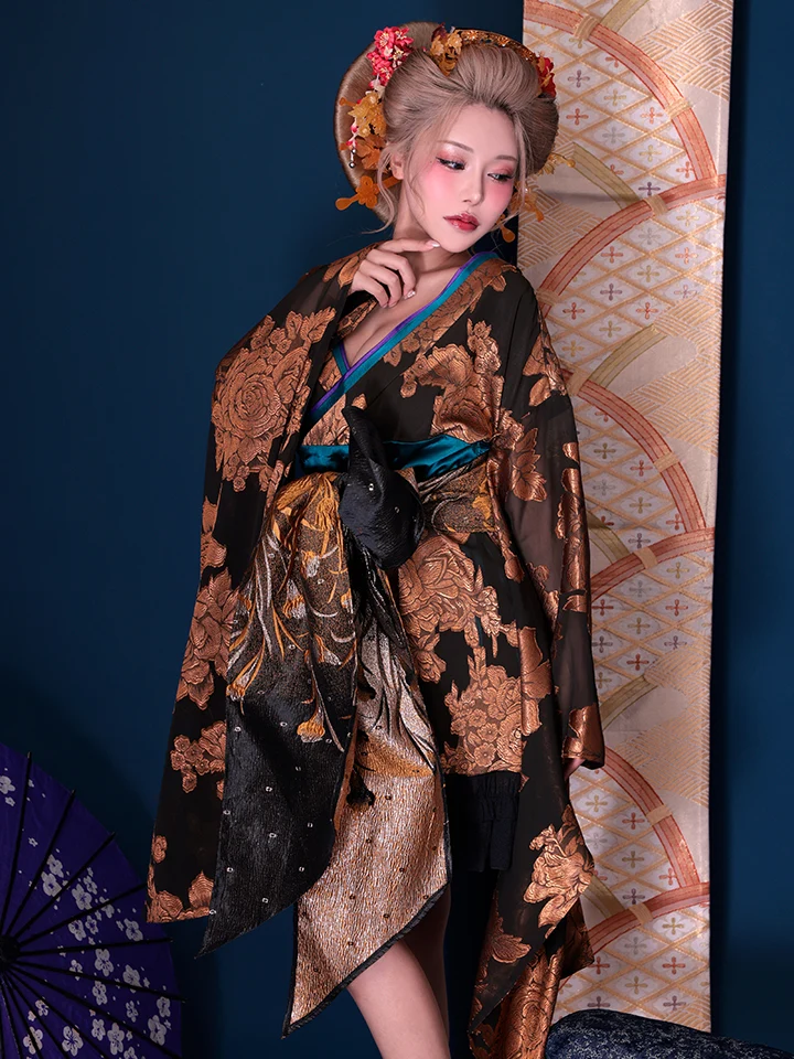 5. 【2点セット】花魁 大奥 ミニ花魁コスプレ 金箔牡丹 黒×金 和柄 本格和装 着物 花魁ドレス| vcsot-250757-1