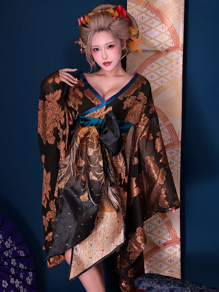 4. 【2点セット】花魁 大奥 ミニ花魁コスプレ 金箔牡丹 黒×金 和柄 本格和装 着物 花魁ドレス| vcsot-250757-1