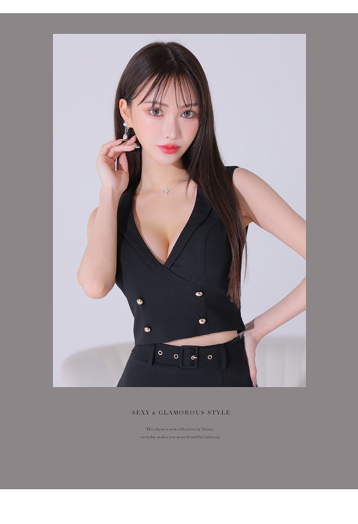 4. Glossy ローブドフルールグロッシー ブラック 襟付きマニッシュダブルボタンセットアップタイトミニキャバドレス gl3523-2