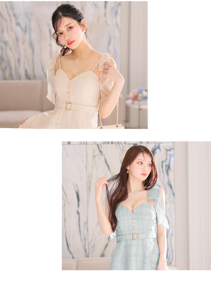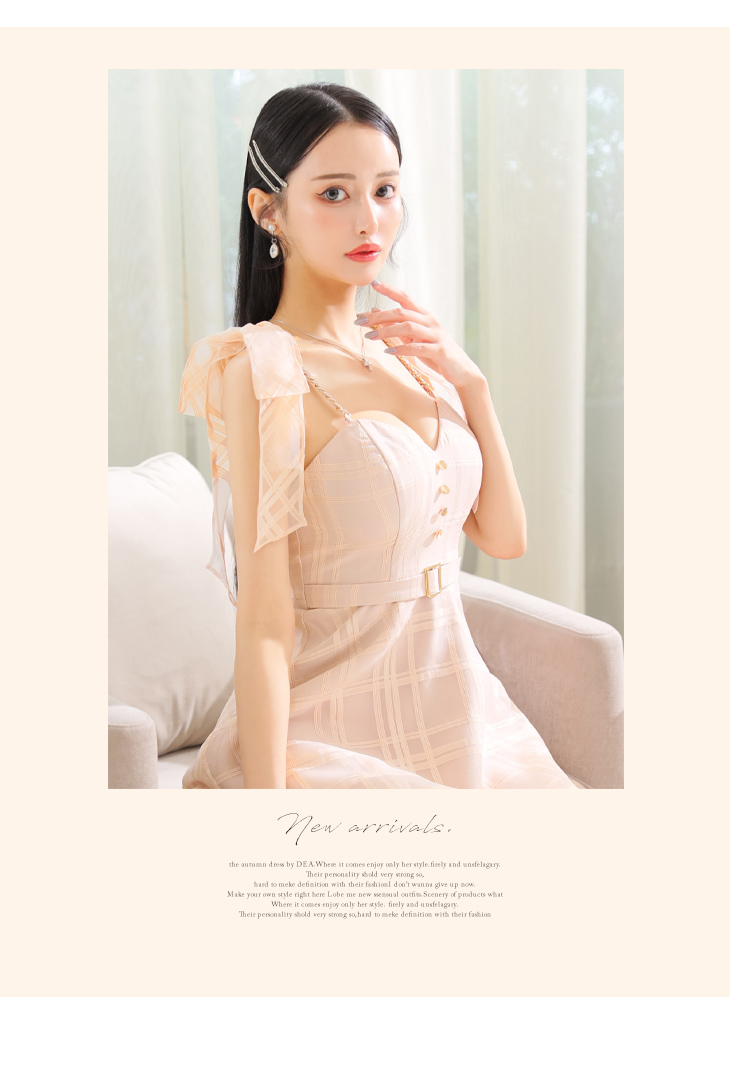 DEA. ディア バイ ローブドフルール 肩リボン×チェック柄オーガンジーフレアロングキャミキャバドレス de3346-c