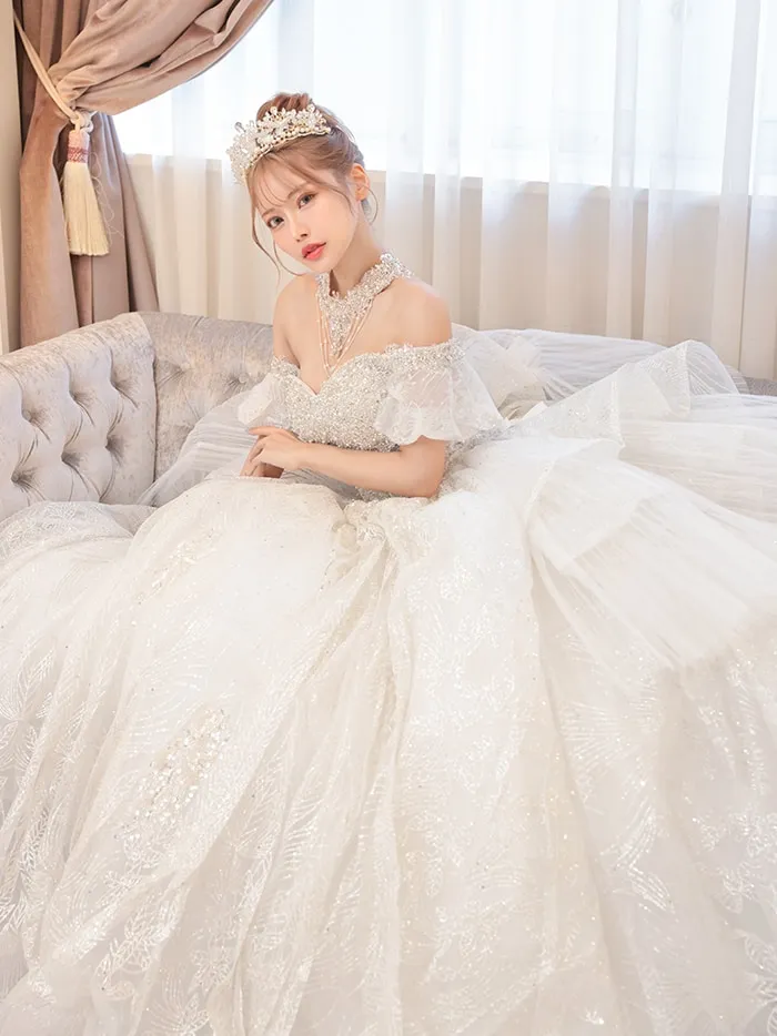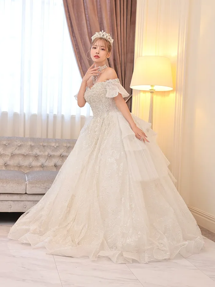 4. 《ご注文後、40日前後で入荷予定》【2点セット】vanityME.couture. バニティミークチュール ダイヤモンド クリスタルビジュー オフショル チューリップスリーブ チョーカーネックレス付き プリンセス 姫 ウエディングドレス ロングドレス ホワイト vctr-t-24109