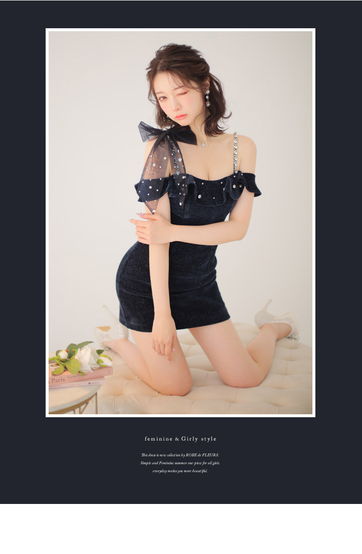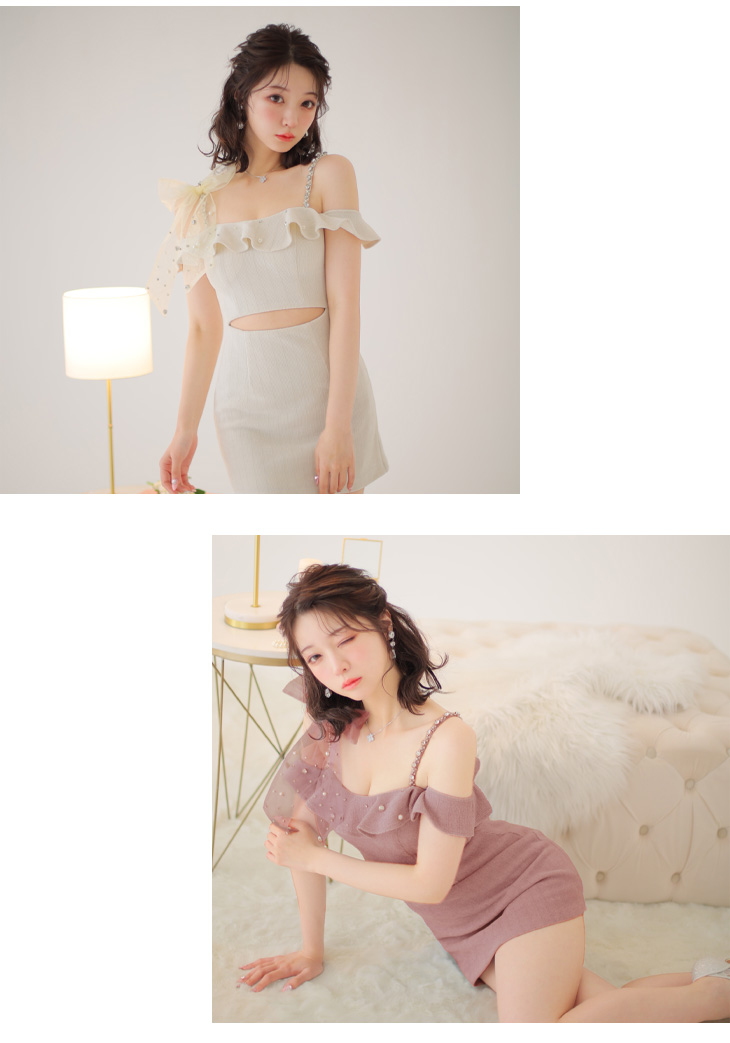 オーガンジーリボンとオフショルダーのフリルがガーリーなミニドレス。