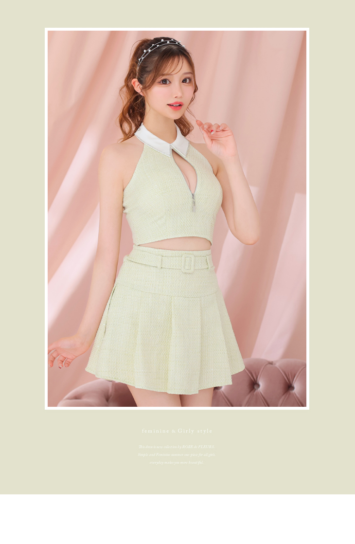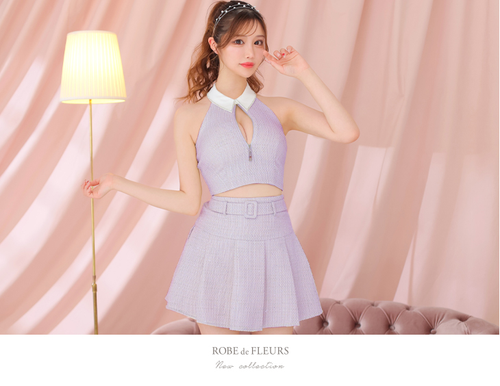 【即日発送】 ROBE de FLEURS ローブドフルール ピンク 襟付きホルタージッパーツイードセットアップドレス fm3216-2