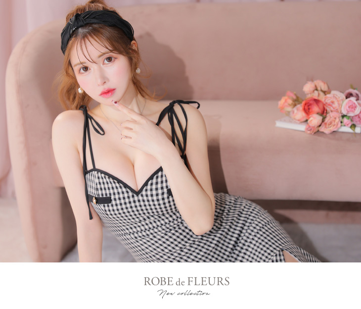 【即日発送】 ROBE de FLEURS ローブドフルール ピンク ショルダーリボンギンガムチェックマーメイドキャバドレス fm3248-1