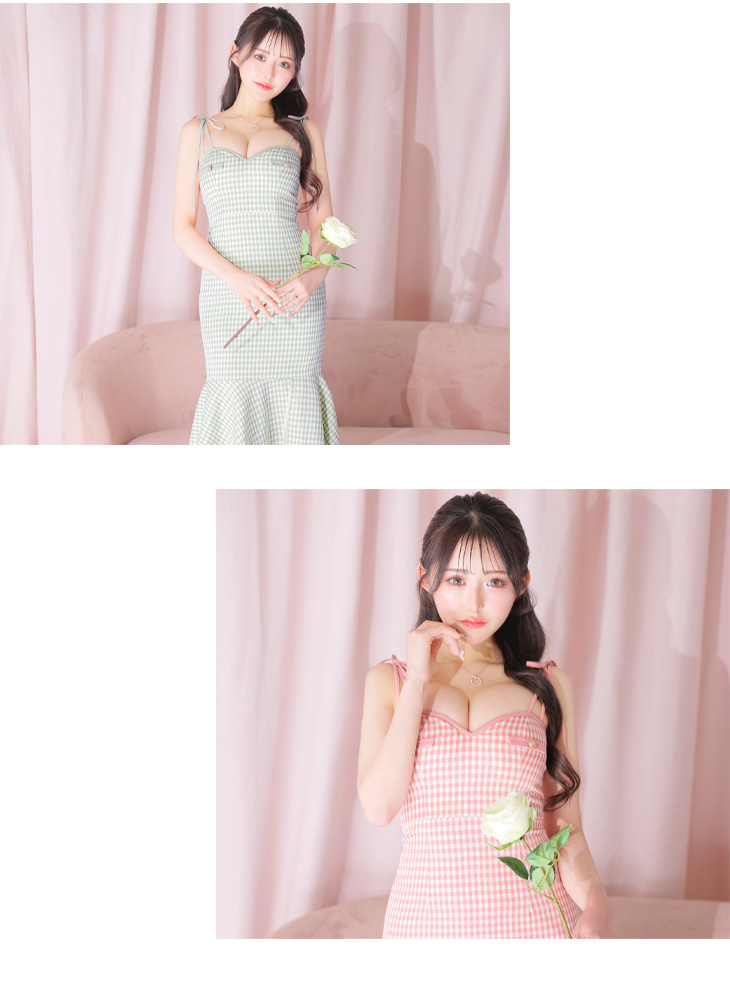 4. ROBE de FLEURS ローブドフルール ピンク ショルダーリボンギンガムチェックマーメイドキャバドレス fm3248-1