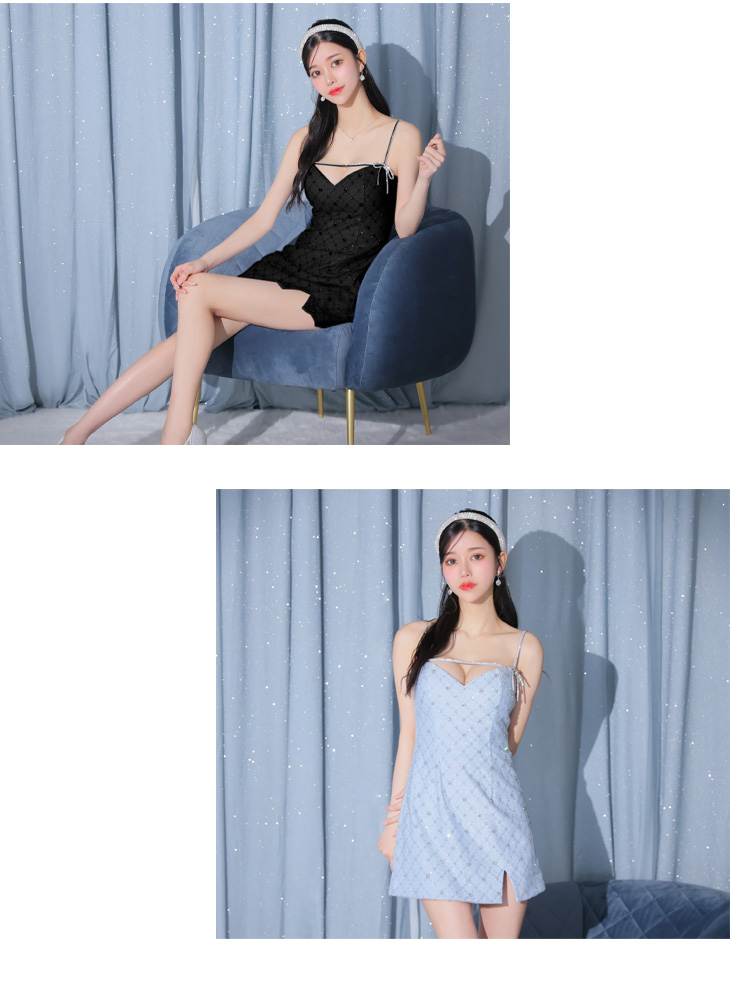 スパンコール生地にビジューを散らしたワンピースドレス。