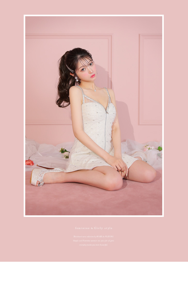 4. ROBE de FLEURS ローブドフルール アイボリー ショルダービジューフロントジッパーフレアミニキャバドレス fm3514-1