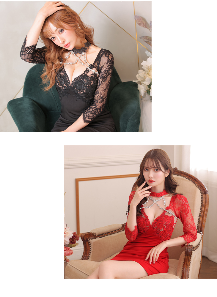 4. Glossy ローブドフルールグロッシー レッド クロスビジューxチョーカー風レース袖ミニドレス gl3108-1