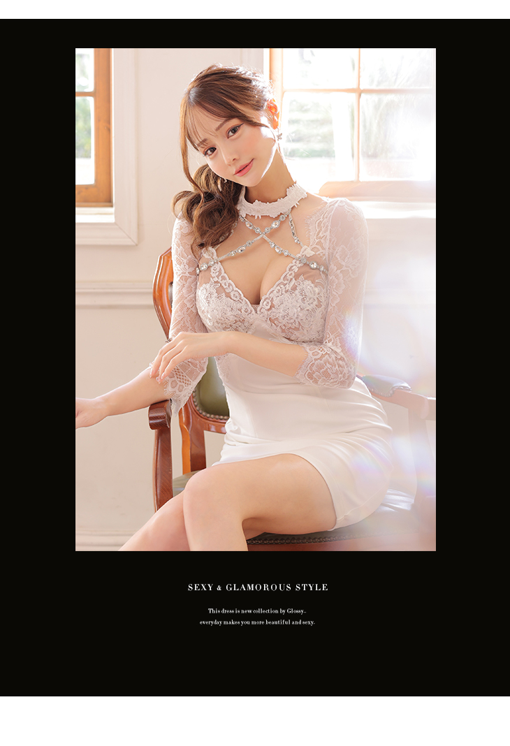 3. Glossy ローブドフルールグロッシー レッド クロスビジューxチョーカー風レース袖ミニドレス gl3108-1