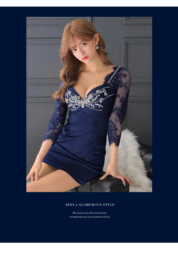 Glossy ローブドフルールグロッシー レーススリーブ×バストビジュータイトミニドレス gl3129-c