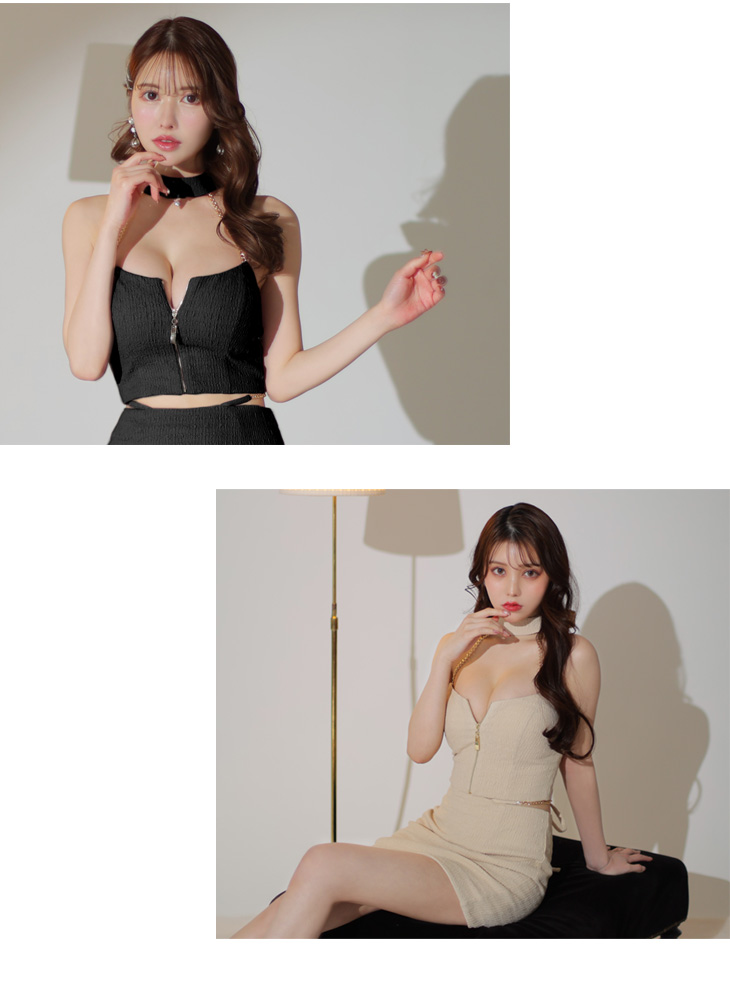チョーカーがチェーンで繋がれたタイトミニドレス。 振り返ると見える大きなリボンが可愛い♡