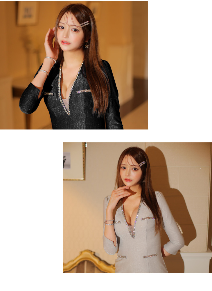 4. Glossy ローブドフルールグロッシー Vネックロングスリーブラメニットタイトミニキャバドレス gl3560-c