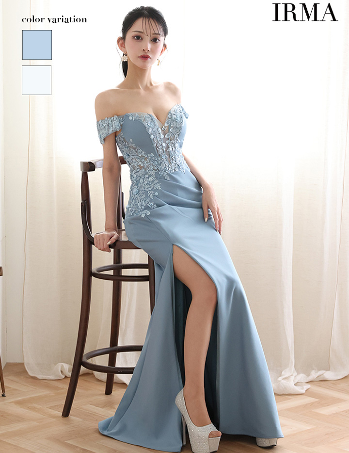 【即日発送】 IRMA イルマ オフショル/立体フラワーモチーフ/刺繍/メッシュ/スリット入り/タイト ロングドレス ir51924