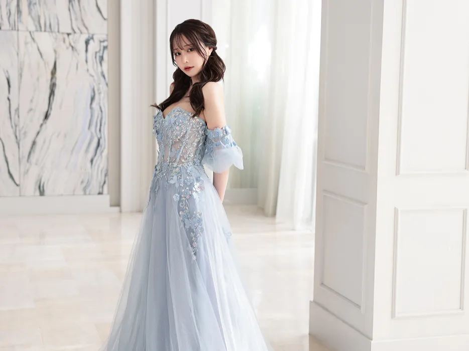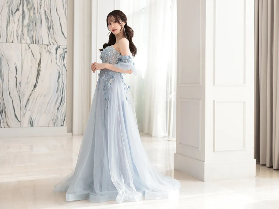【Couture.Dress Sale】vanityME.couture. バニティーミークチュール パフスリーブ フラワー×バタフライモチーフ スパンコール刺繍 プリンセス 姫 ロングドレス バースデードレス パリブルー vctr-l-a1108