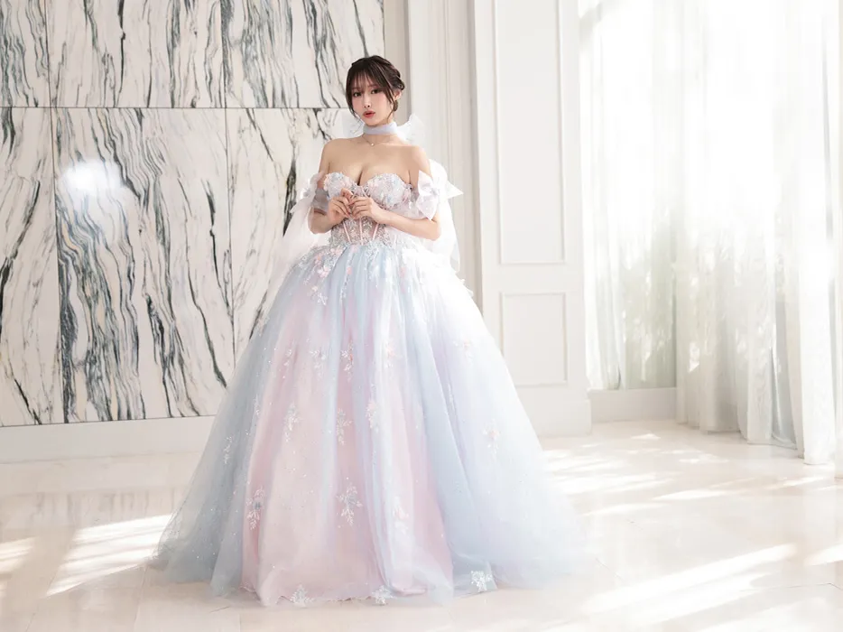 【3点セット】vanityME.couture. バニティーミークチュール オーロラグラデーション フラワーモチーフ リボン ショール・スリーブ付き プリンセス 姫 ロングドレス バースデードレス ブルーピンク vctr-l-gl3570