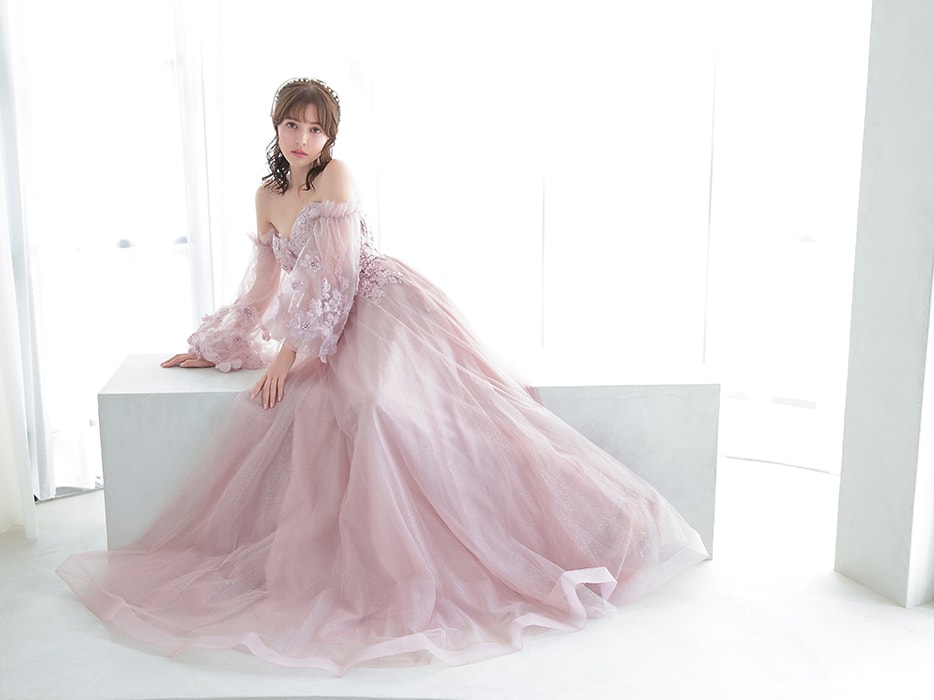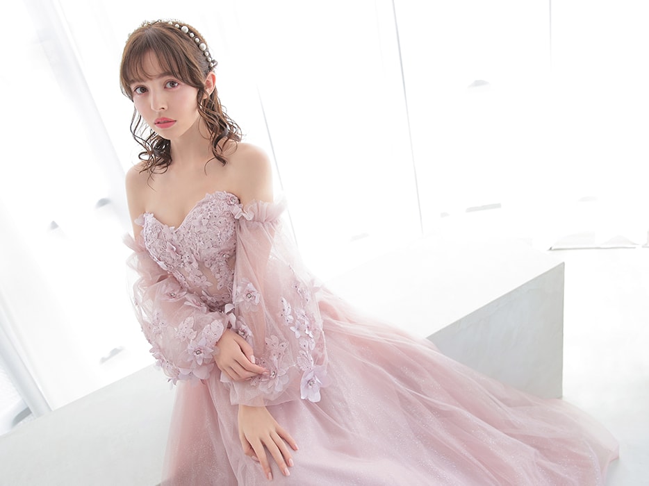 胸元の刺繍とビジュが華やかでラメ入りのスカートもキラキラ輝き上品で綺麗に見れるこだわりが詰まった特別なドレスです。 パフ袖は取り外しもでき、2WAYスタイルで楽しめます。