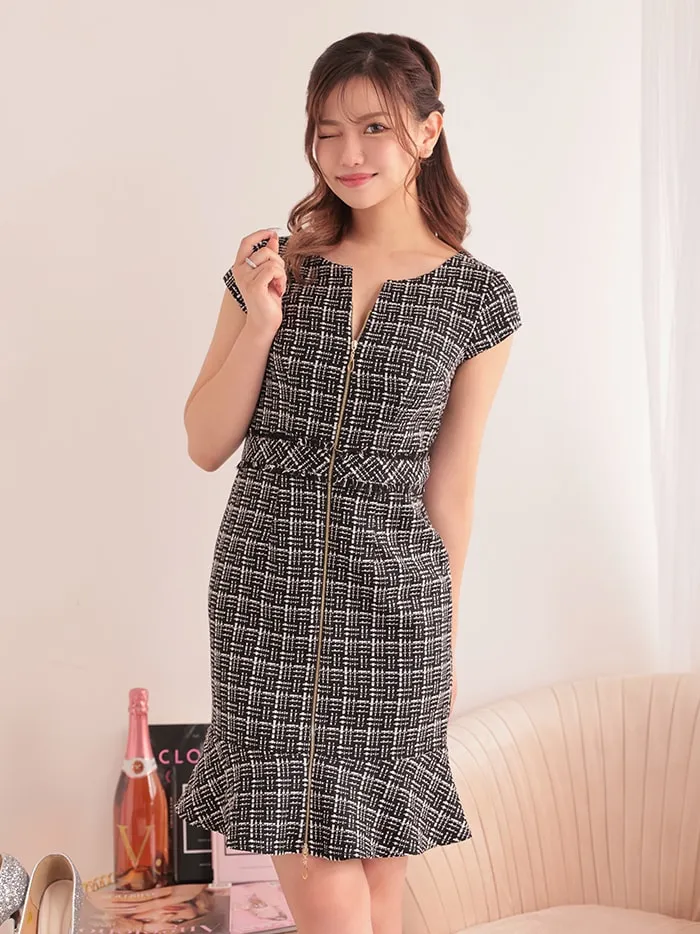 vanityME.onep フロントジップ 半袖 ミックスツイード ウエスト切替 マーメイドライン ミディアムドレス ワンピース [ ブラック ] vim-c2305-2