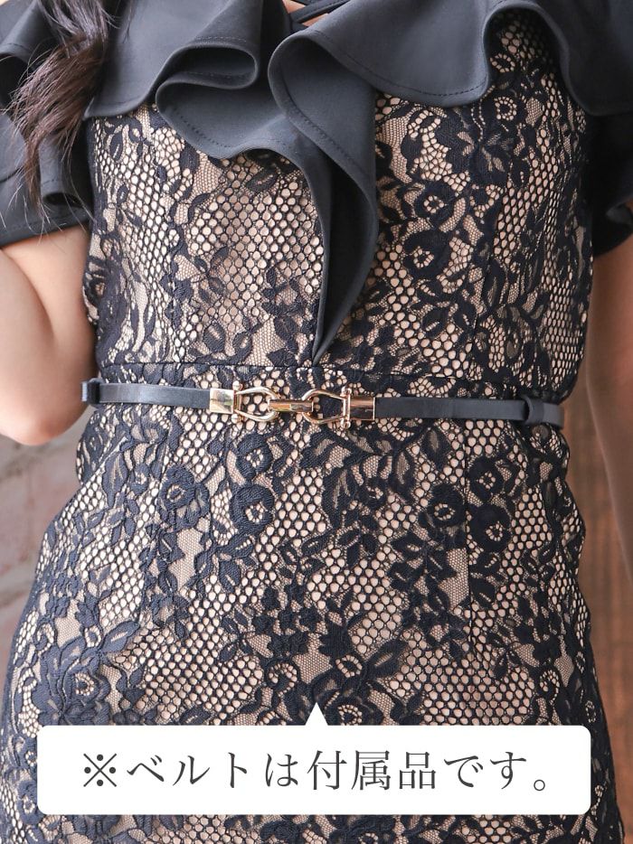 【即日発送】 【vanityME.OUTLET】【2点セット】総レースボリュームフリル レースキャミフリルクロスデザインベルトタイトミニドレス ベルト付き[ブラック] vim-j-686