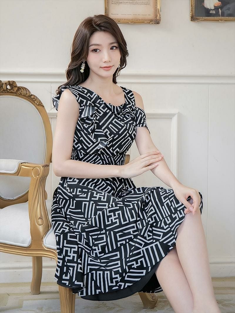 【即日発送】 ERUKEI エルケイ GINZA COUTURE ブラック プリント ・肩フリル・フレア・ミニドレス・ワンピース ek-c22023-1