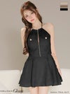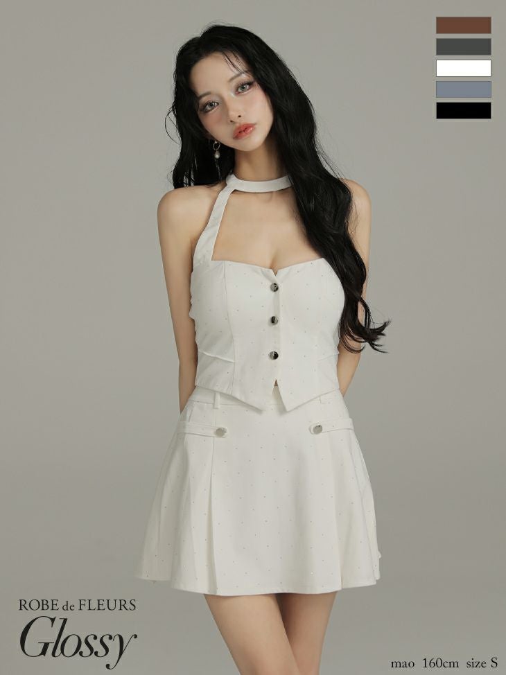 【即日発送】 Glossy ローブドフルールグロッシー 【XSサイズあり】ストーン付きホルターシルバーボタンセットアップフレアミニキャバドレス gl4117