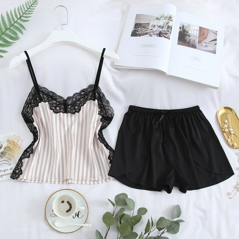 【即日発送】 【2点セット】ストライプ バイカラー レース キャミソール ショートパンツ ルームウエアーセット vuw-c0002