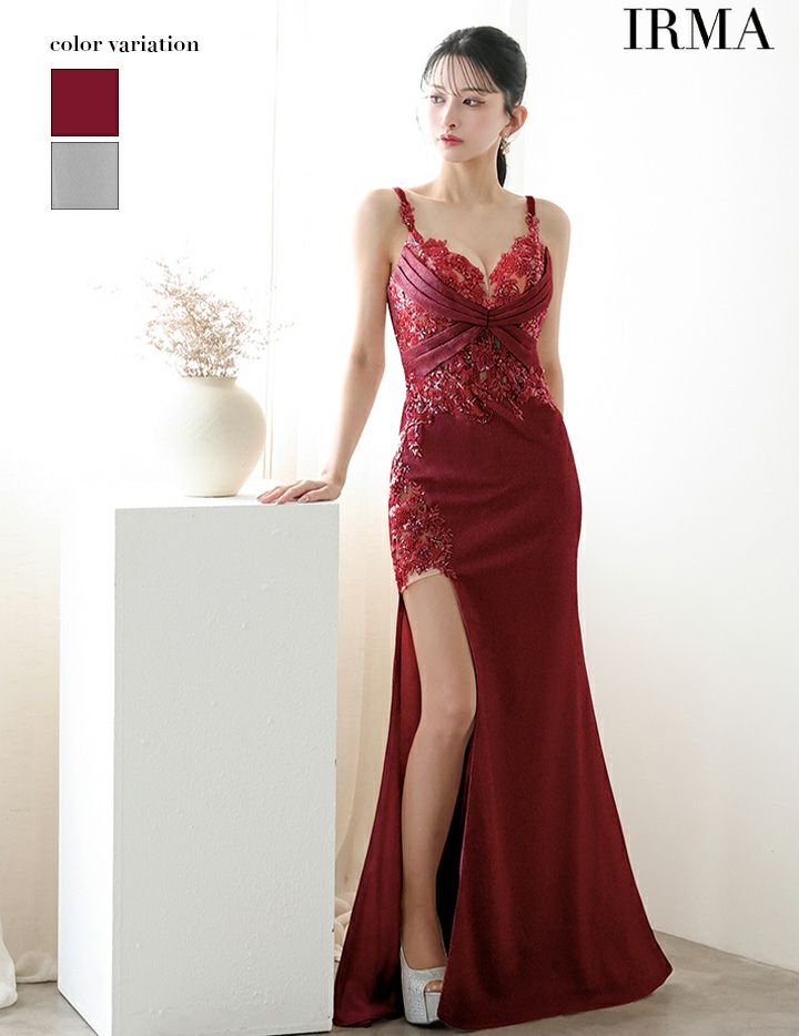 【即日発送】 IRMA イルマ バストクロスタックライン/刺繍総レース/シアー切替/スリット入り/タイト ロングドレス ir51923