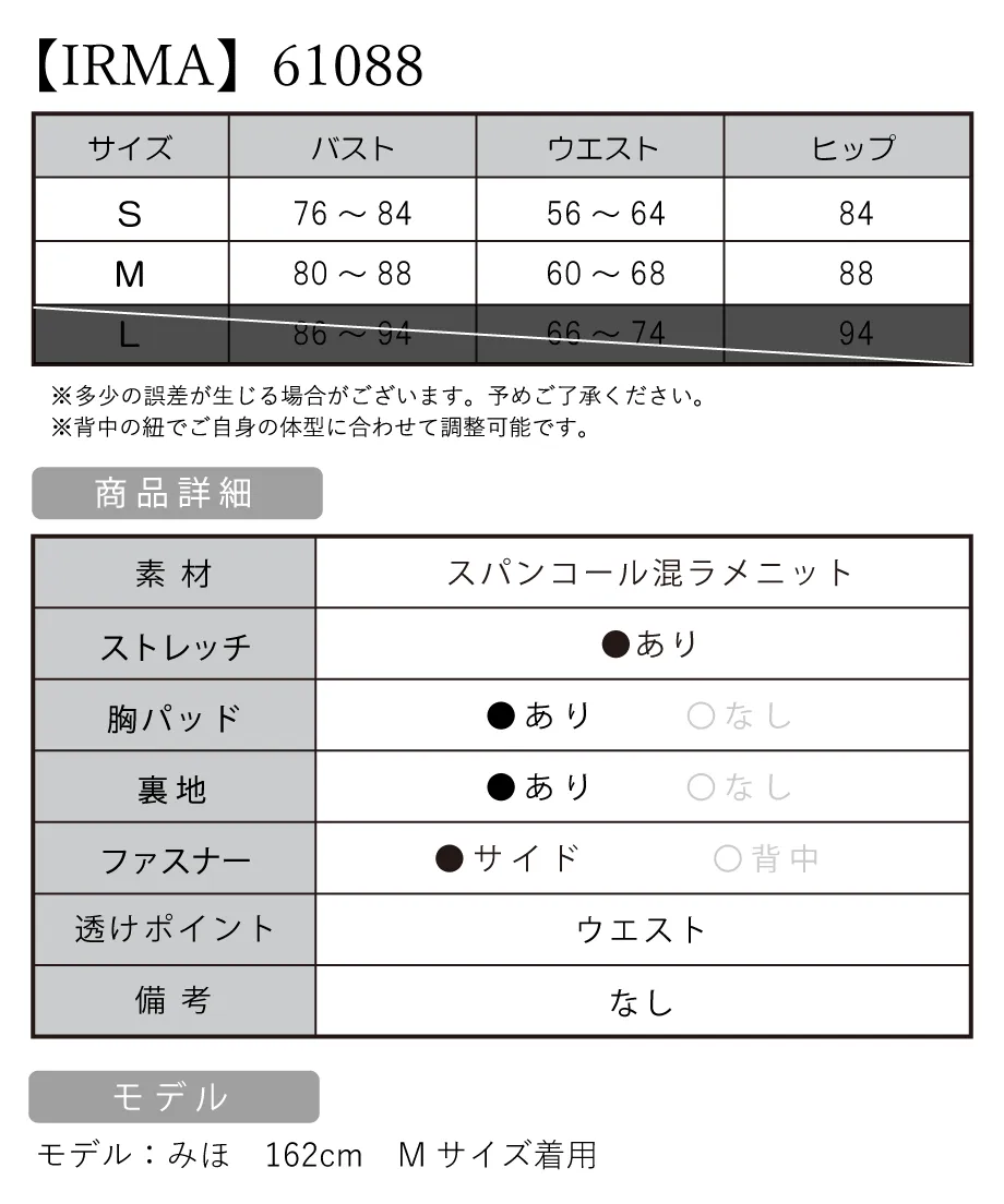 【予約商品*】 【4月上旬頃入荷予定】IRMA イルマ ワンカラー/スパンコール/レース/シースルー/コルセット/スリット入り/タイト ロングドレス ir61088