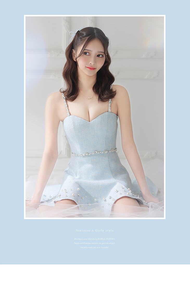 3. ROBE de FLEURS ローブドフルール ブルー スプリングツイード×ビジューパールセットアップドレス fm2516-1
