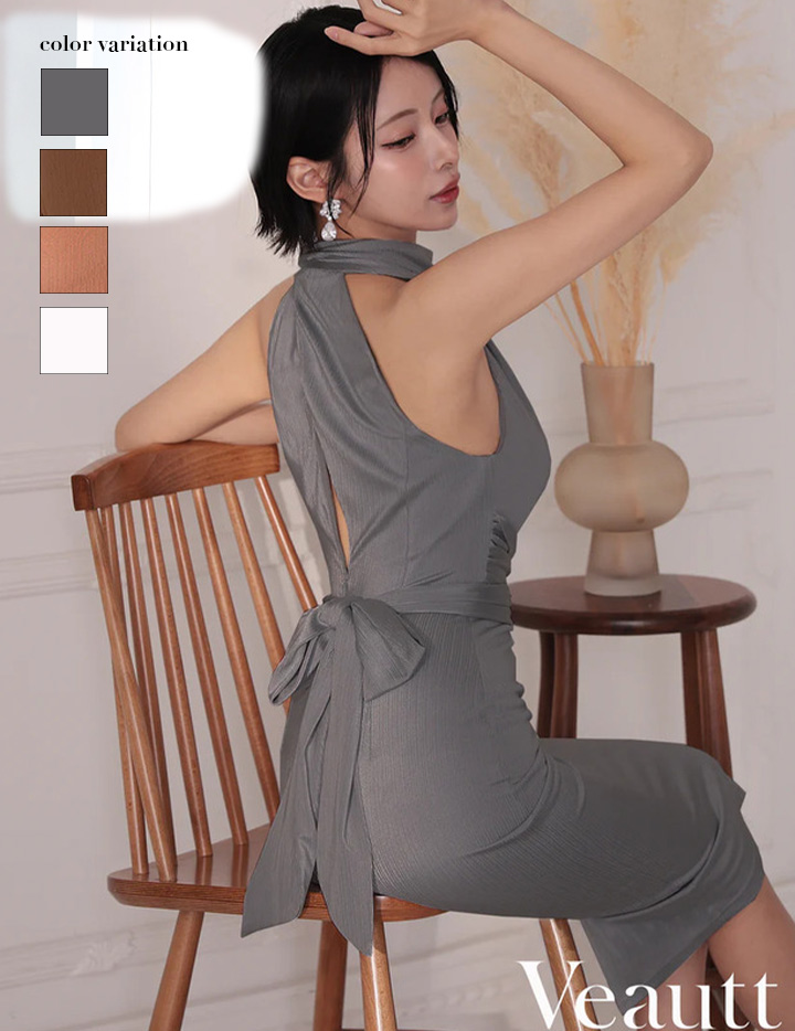 Veautt ヴュート ハイネックバックオープンリボンウエストマークタイトミディアムドレス vt022522