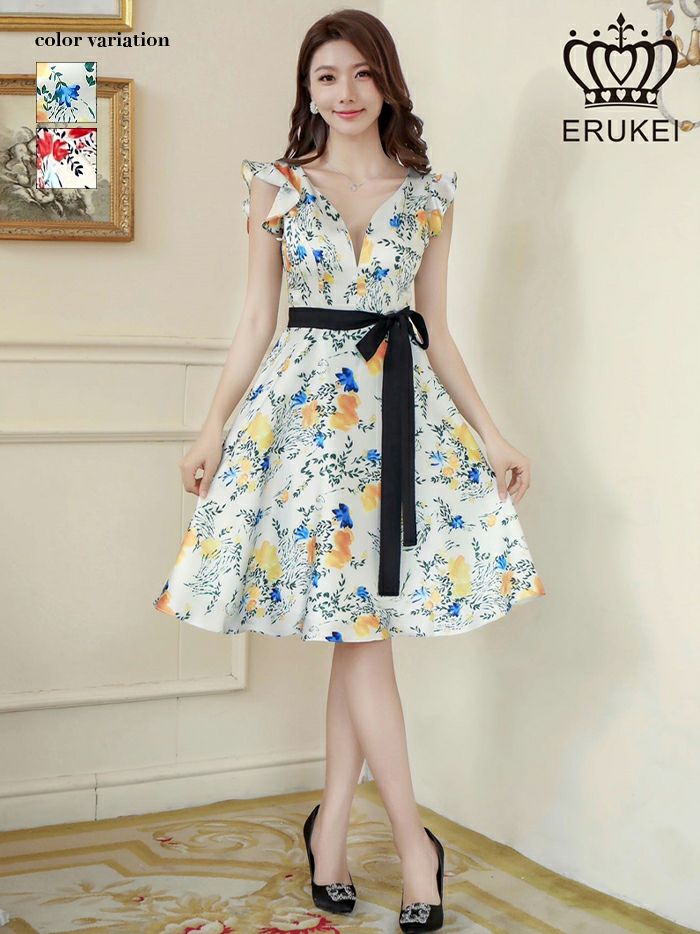 5. ERUKEI エルケイ 花柄・プリント・サテン・フリルスリーブ ・リボンベルト・ミニドレス・ワンピース ek-e33077-1