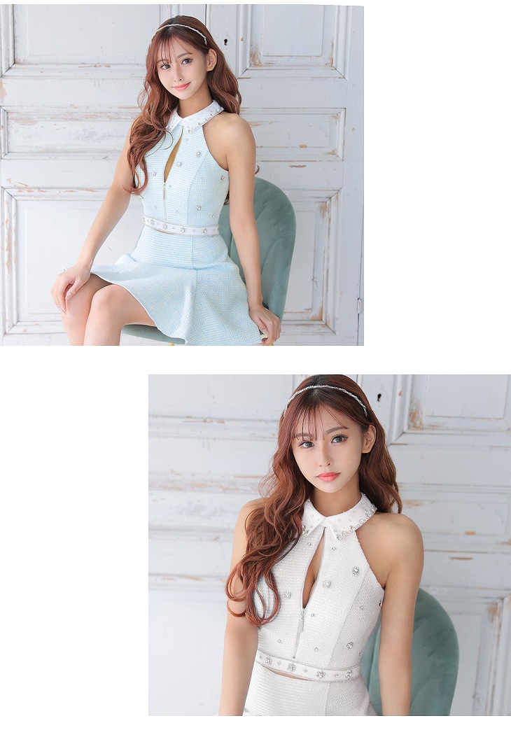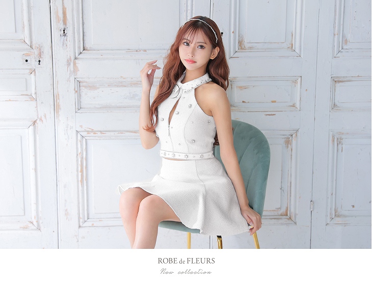 【即日発送】 ROBE de FLEURS ローブドフルール ブルー ツイード×ビジューセットアップミニドレス fm2891-1