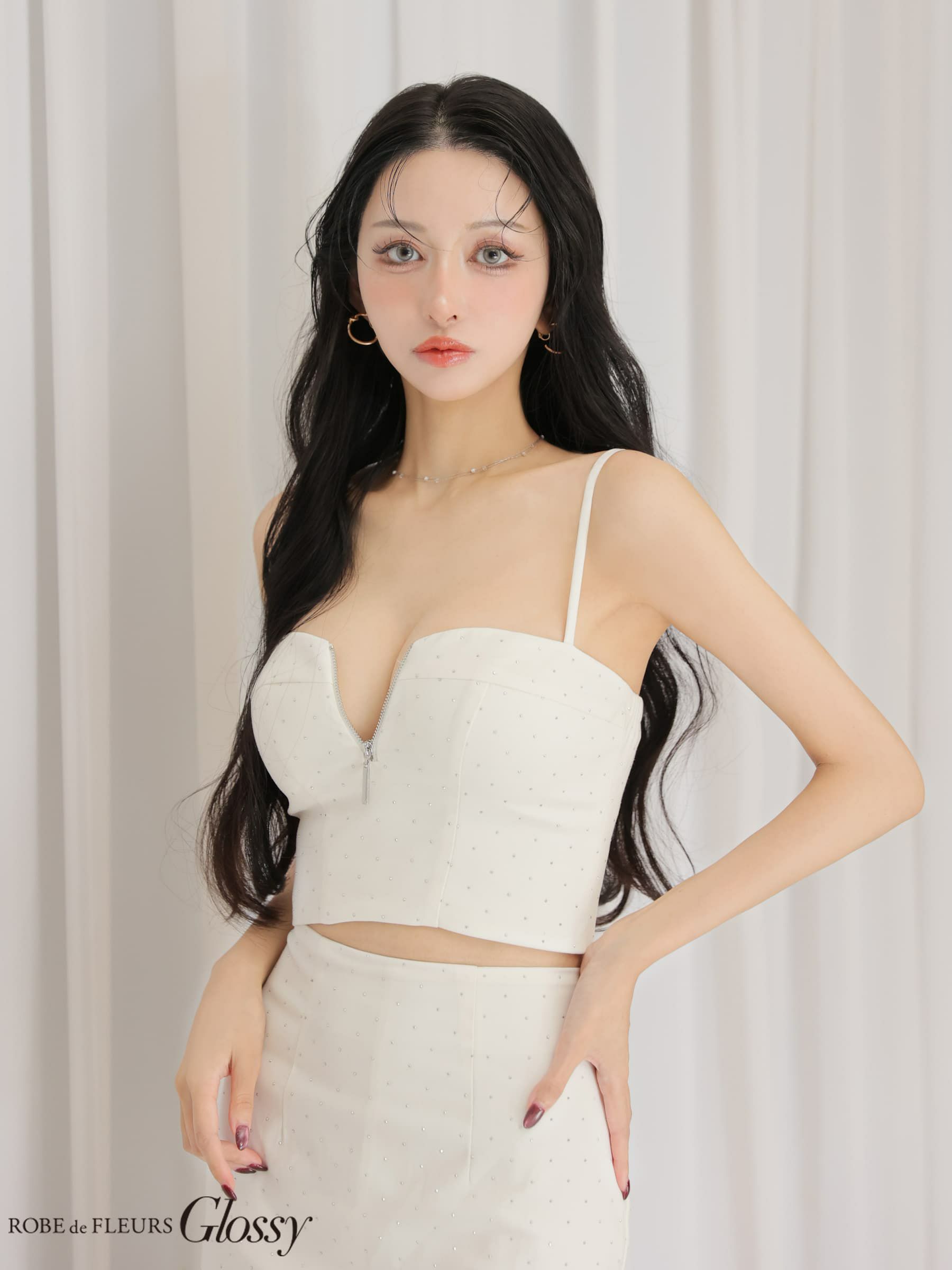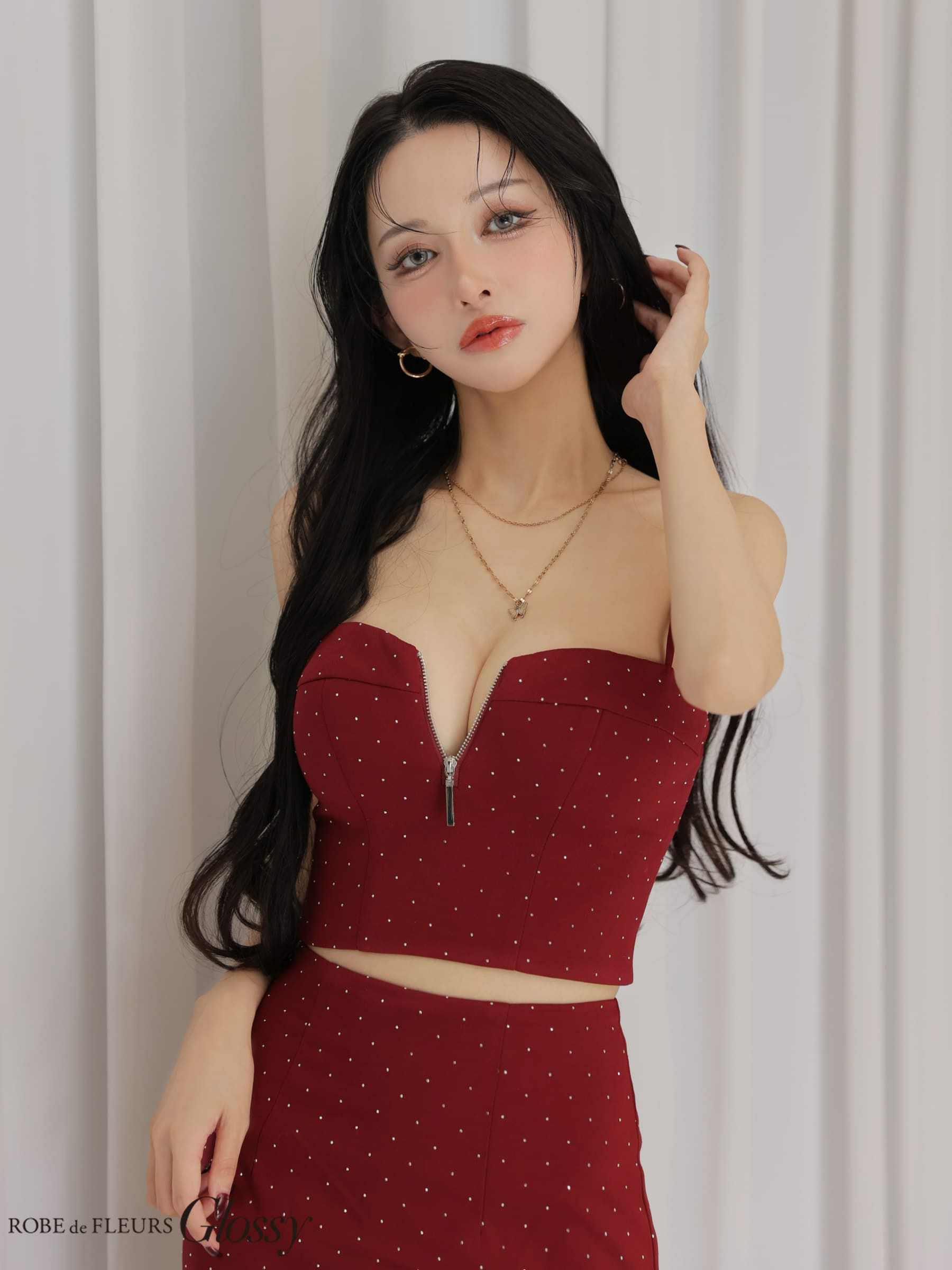 全面に煌めくストーンが散りばめられた、ラグジュアリーなベアトップセットアップ。