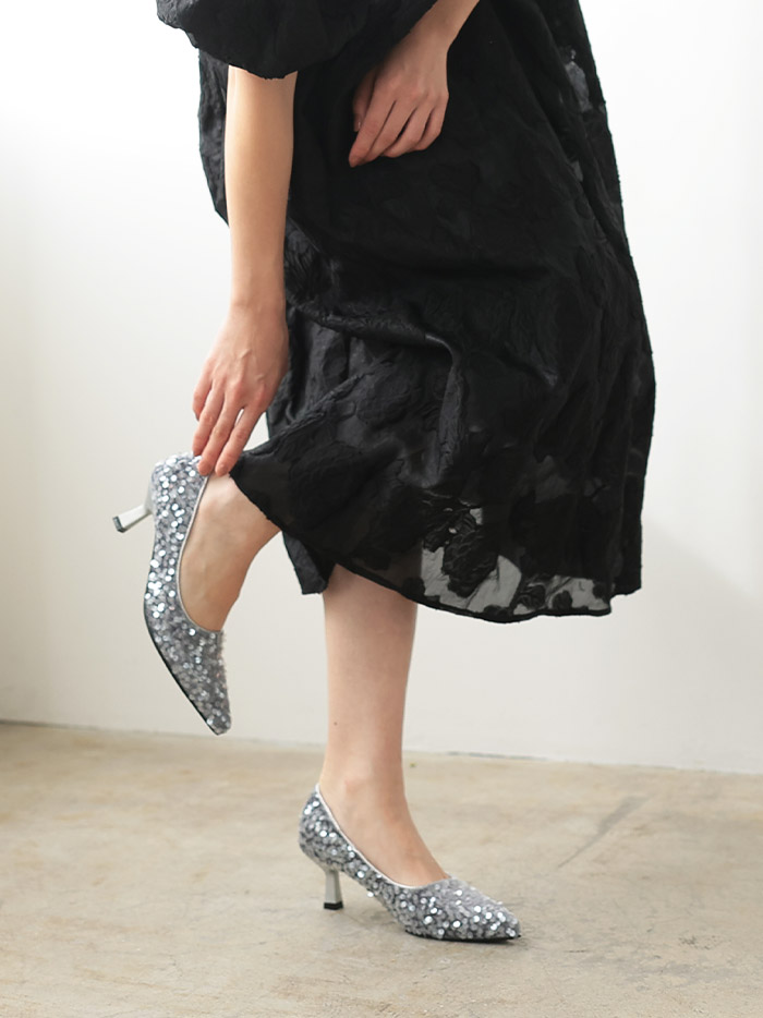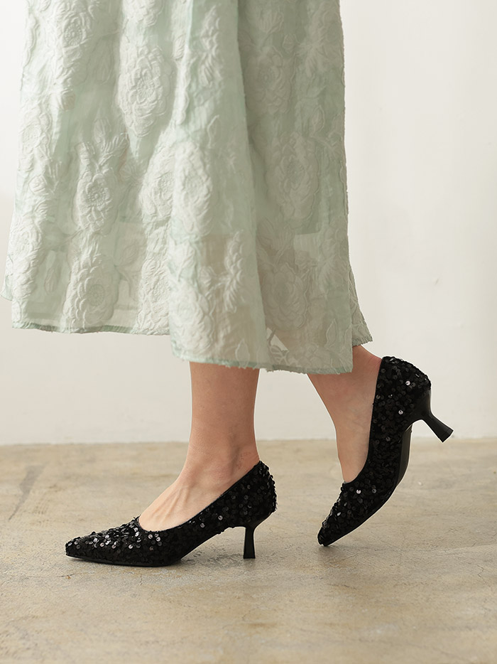 スパンコールを全体的にほどこした華やかなパンプス。