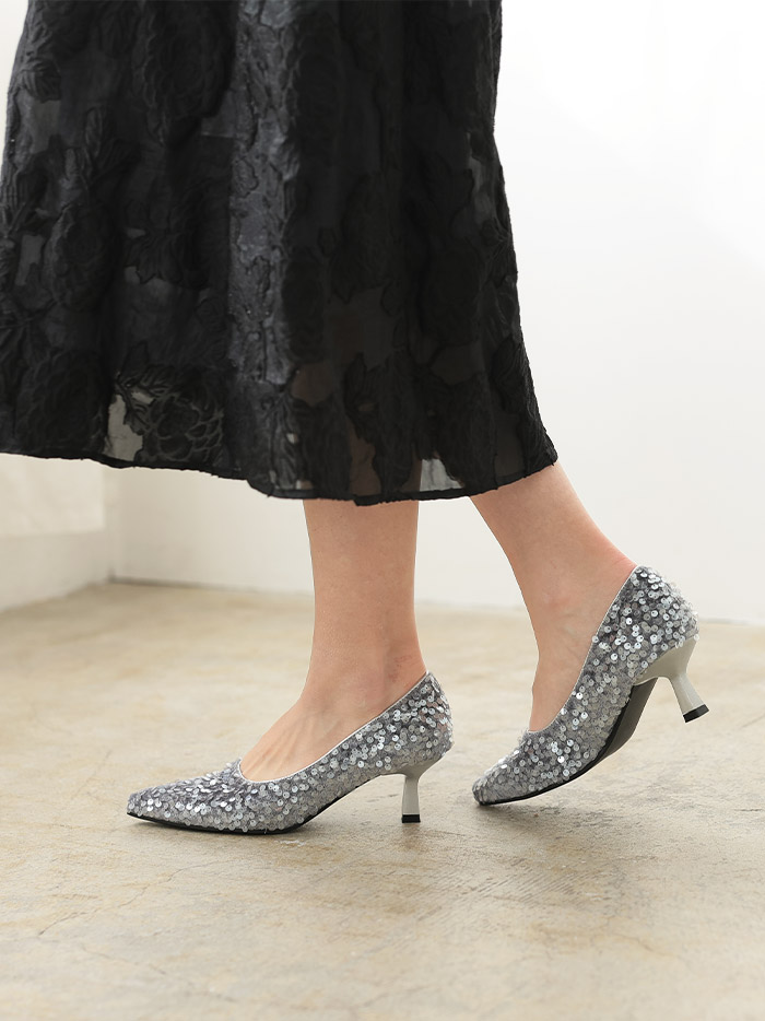 歩くたびにスパンコールが輝くパンプスはナイトシーンや、薄暗い場内などで