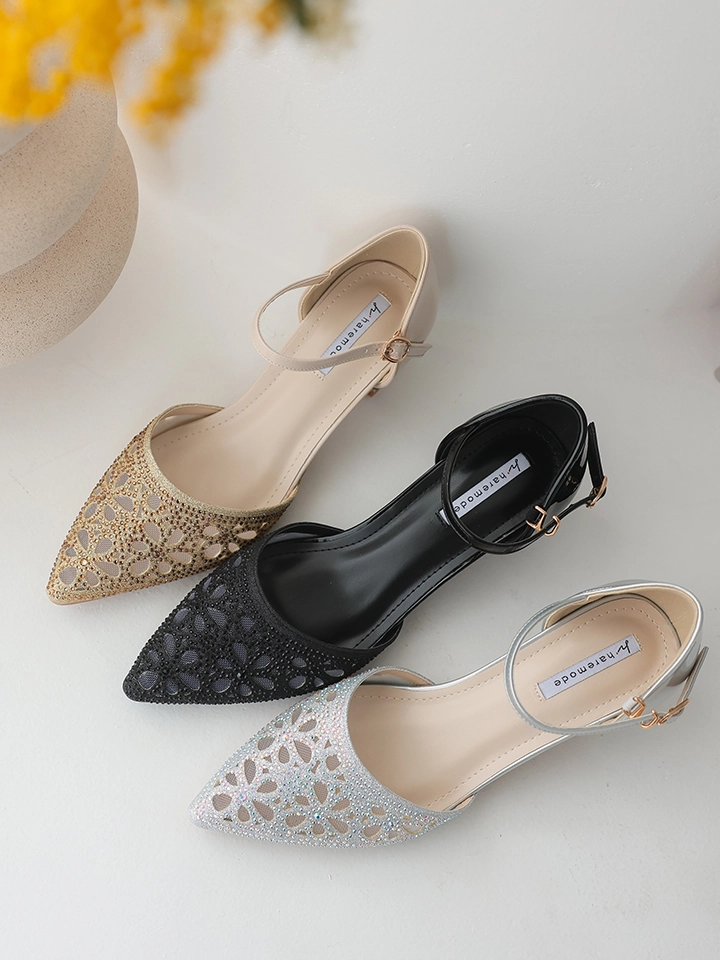 花びらのようなカットデザインにビジューをあしらい、足元を美しく演出します。