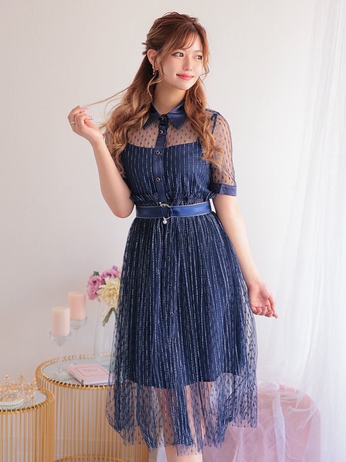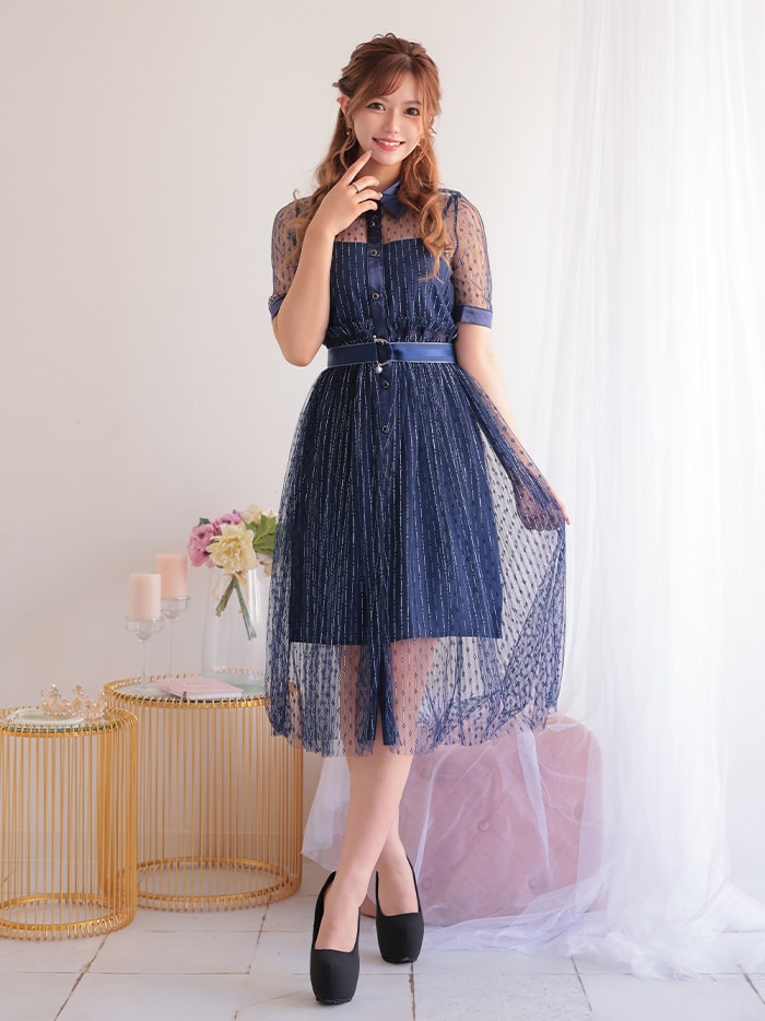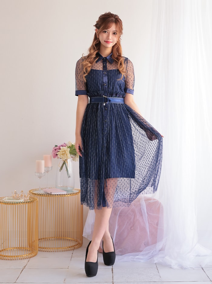 vanityME.onep ストライプチュール 襟付き パイピング マキシワンピース【ベルト付き】 [ネイビー] vim-c2393